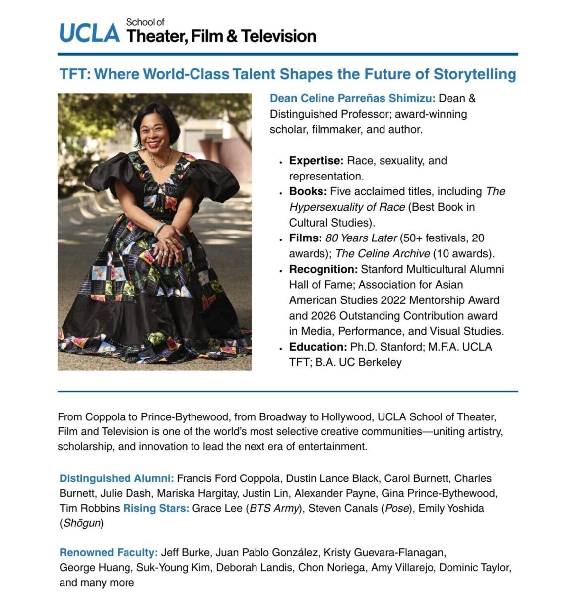 Celine Parreñas Shimizu is Dean of Theater, Film and Television and Distinguished Professor of Film, Television and Digital Media at UCLA. A premier scholar of race and sexuality in representation, her books include The Movies of Racial Childhoods (Duke, 2024), which won the top prize in Media, Performance, and Visual Studies from the Association for Asian American Studies in 2026; The Proximity of Other Skins (Oxford, 2020); Straitjacket Sexualities (Stanford, 2012); and The Hypersexuality of Race (2007), winner of Best Book in Cultural Studies from the Association for Asian American Studies, which also awarded her the 2022 Excellence in Mentorship Award. Her peer-reviewed articles appear in top journals in cinema, performance, ethnic, feminist, sexuality studies, and transnational popular culture. Her writings are translated to French, German, Italian, Portuguese and Spanish. Distributed by Women Make Movies, her films The Celine Archive (2020) and 80 Years Later: On Japanese American Racial Inheritance (2022) each won several festival awards. Her latest So To Speak (2025) is on the festival circuit. She received her Ph.D. in Modern Thought and Literature from Stanford University (which inducted her into its Multicultural Alumni Hall of Fame in 2023), her M.F.A. in Film Directing and Production from UCLA School of Theater, Film and Television and her B.A. in Ethnic Studies from U.C. Berkeley.