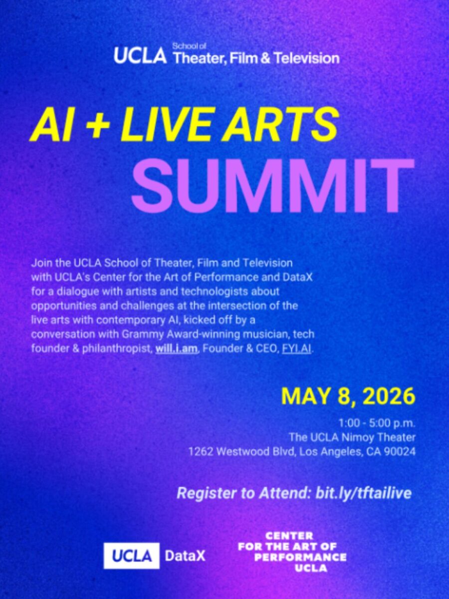 Join the UCLA School of Theater, Film and Television with UCLA’s Center for the Art of Performance and DataX for a dialogue with artists and technologists about opportunities and challenges at the intersection of the live arts with contemporary AI, kicked off by a conversation with Grammy Award-winning musician, tech founder & philanthropist, will.i.am, Founder & CEO, FYI.AI.